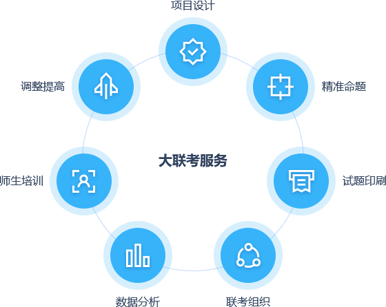 学科联考联盟服务整个流程包括“项目设计-精准命题-试题印制-联考组织-数据分析-师生培训-调整提高”,